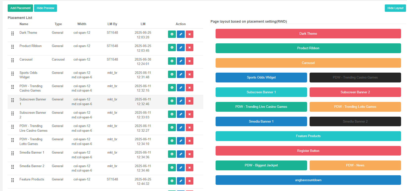 - 版位採用 CSS Grid(grid-cols-12) 設計,運營人員可以自行調整 RWD 排版