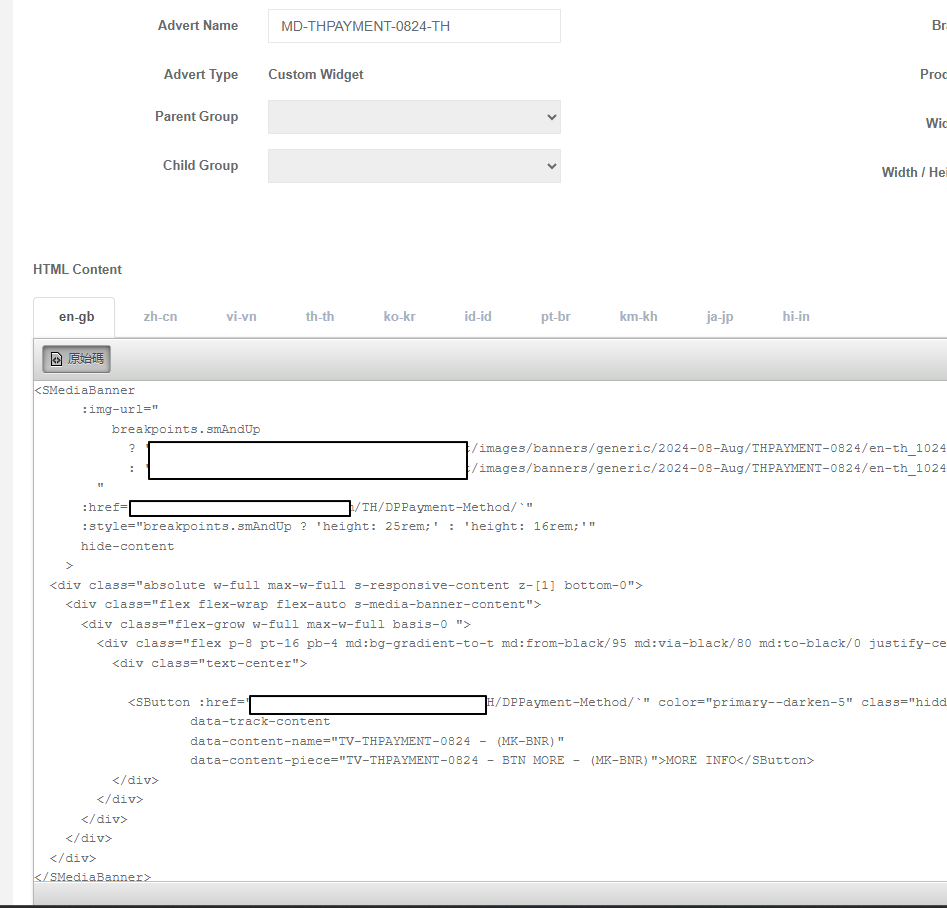 廣告內容,含多語系 HTML 片段 |